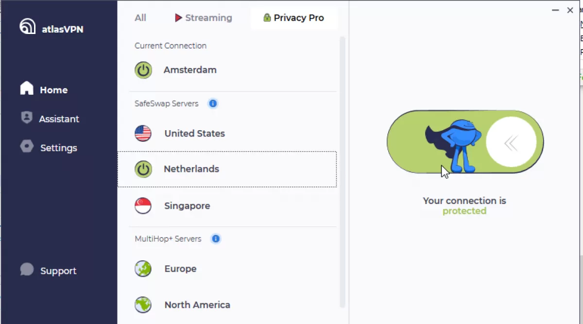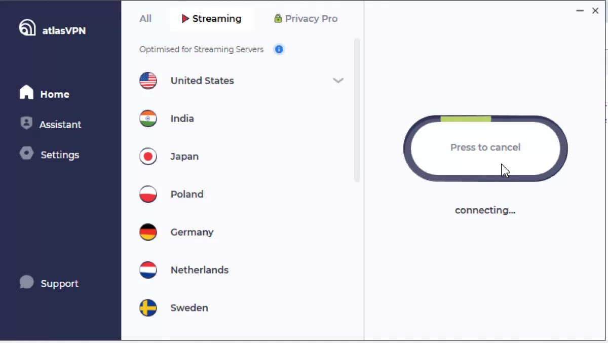 - 無料版は、Apple App Store、Google Play Store、またはWebサイトからATLAS VPNをダウンロードすることによって、すべてのユーザーが利用できます。ダウンロードしたら、アプリを開き、利用可能な3つの場所のいずれかを選択してください。